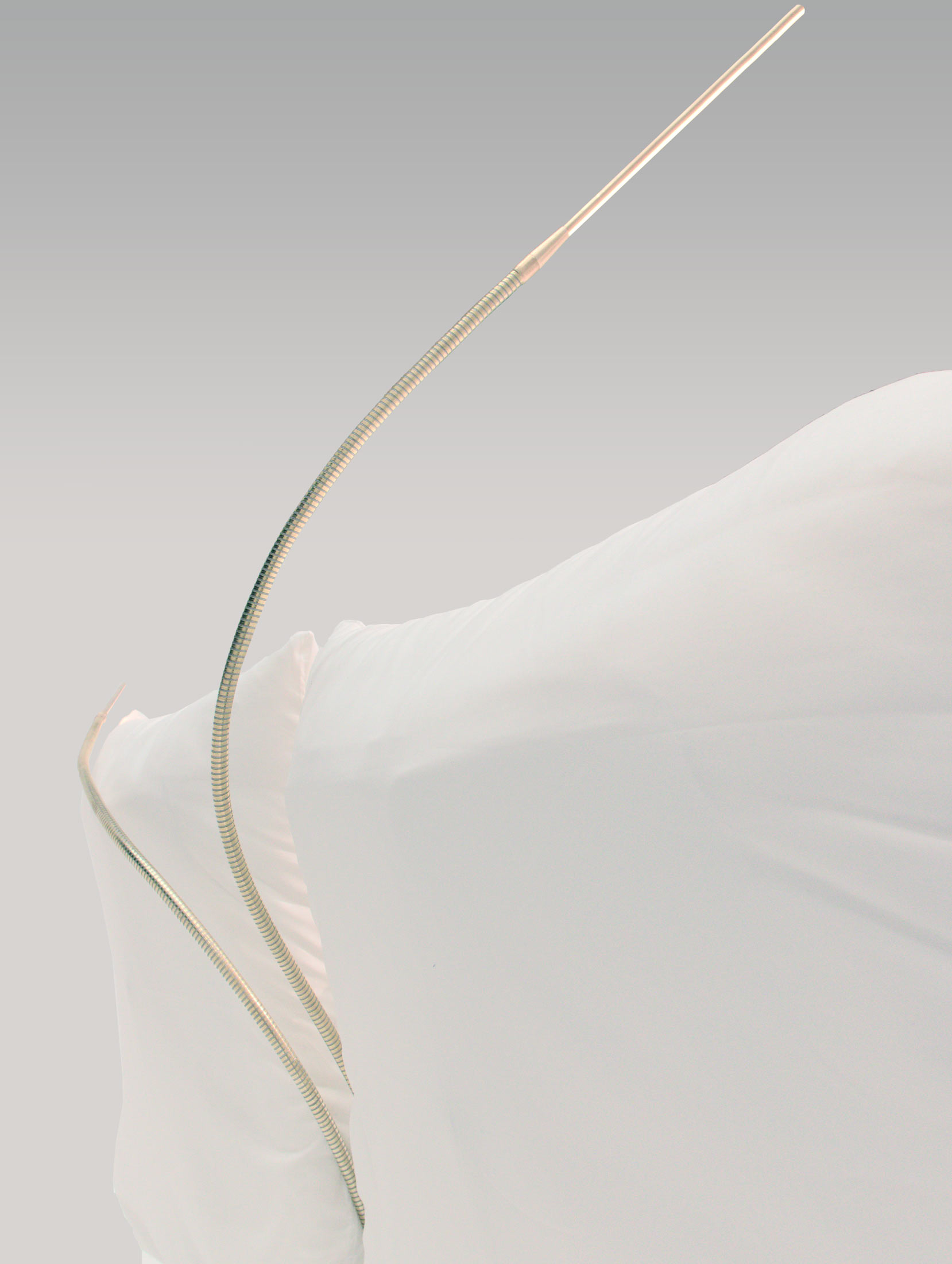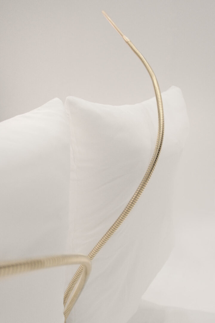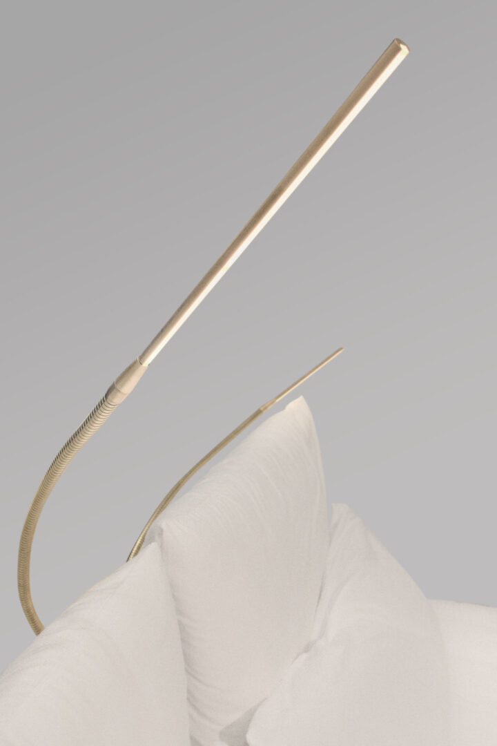 Die Leseleuchten sind aus Messing Vollmaterial gedreht und gefräst. Sie bringen mit ihrem edlen Flex-Schlauch das Licht immer an die gewünschte Stelle. Der nur 3mm breite Lichtschlitz ist zusätzlich 180° drehbar. Mit 30cm langer, warmweißer Lichtquelle und hohem Farbwiedergabeindex bleibt kein Buchbund verschattet. Die Leseleuchten werden wie das Nachtlicht auf beiden Seiten mit verdeckten Dimmtastern geschaltet. Durch die mittige Anordnung am Kopfende und die große Flexibilität kann eine Leuchte für zwei Personen ausreichend sein. Die tanzenden Schwanenhälse bringen den spielerisches Element hinzu und ergänzen damit das Gesamtbild des Objekts.