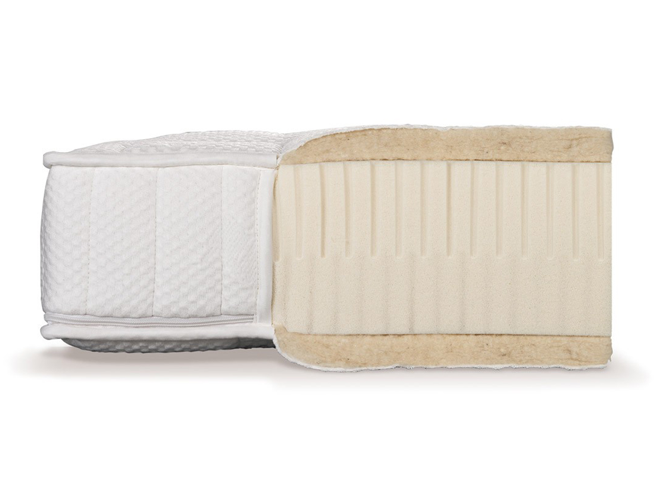 Der Kern besteht aus hochwertigem Naturlatex mit hoher Punktelastizität und vertikalen Luftkanälen für beste Klimaregulation. Die beiden Hälften sind in unterschiedlichen Härtegraden (weich / mittel / fest) für das jeweilige Körpergewicht (bis 75 kg / bis 100 kg / bis 140 kg) wählbar und erhalten einen gemeinsamen Bezug.